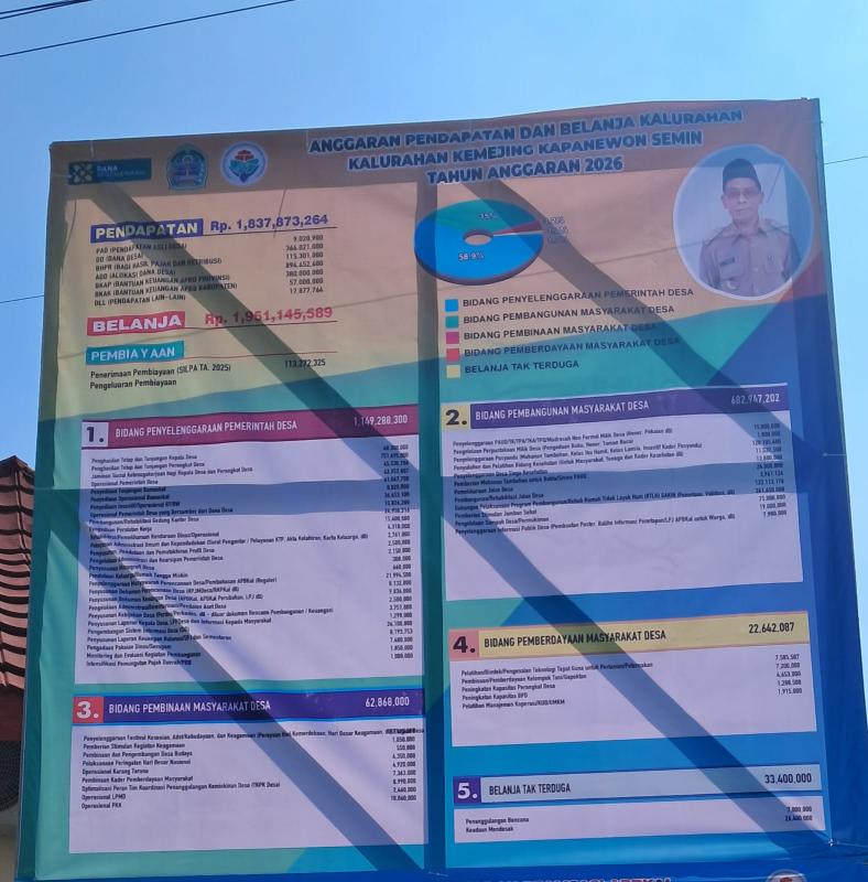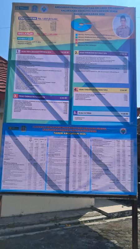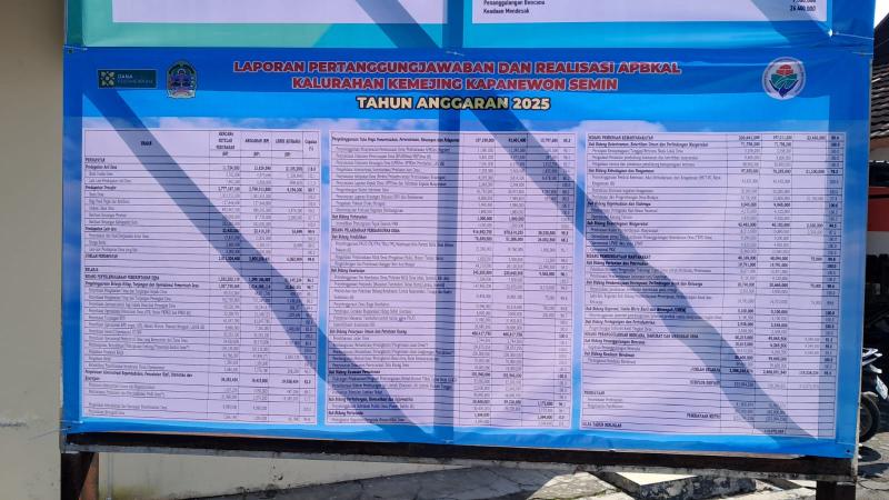 Pemerintah Kalurahan Kemejing memasang baliho transparansi anggaran sebagai bentuk keterbukaan informasi kepada masyarakat, yang memuat Laporan Pertanggungjawaban (LPJ) Tahun Anggaran 2025 serta Anggaran Pendapatan dan Belanja Kalurahan (APBKal) Tahun 2026. Baliho tersebut dipasang di halaman Balai Kalurahan Kemejing agar dapat dengan mudah diakses dan dibaca oleh warga.