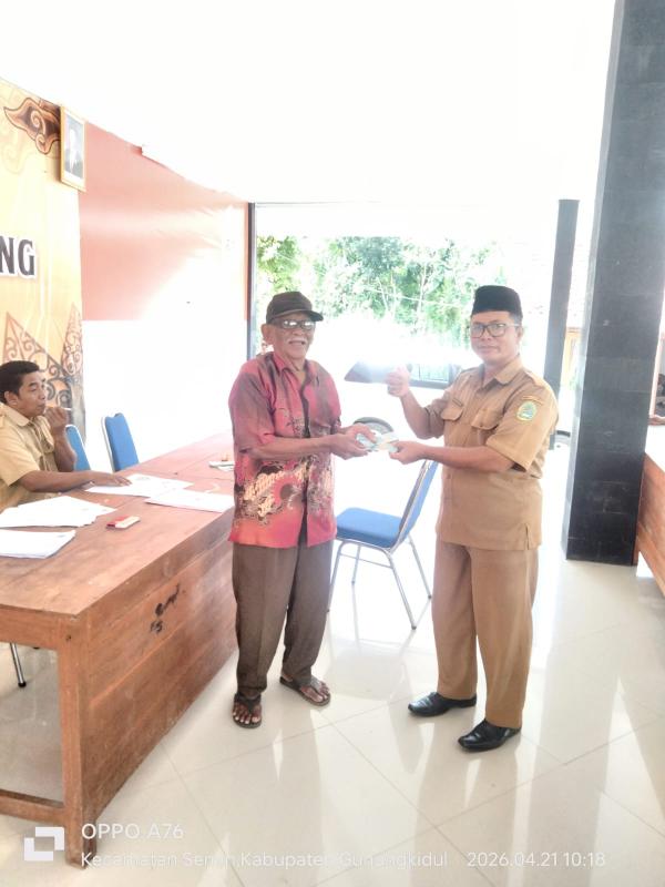 Kalurahan Kemejing melaksanakan kegiatan penyaluran Bantuan Langsung Tunai Dana Desa (BLT DD) Tahun 2026 pada hari Selasa, 21 April 2026. Kegiatan ini bertempat di Aula Balai Kalurahan Kemejing dan berlangsung dengan tertib serta lancar.